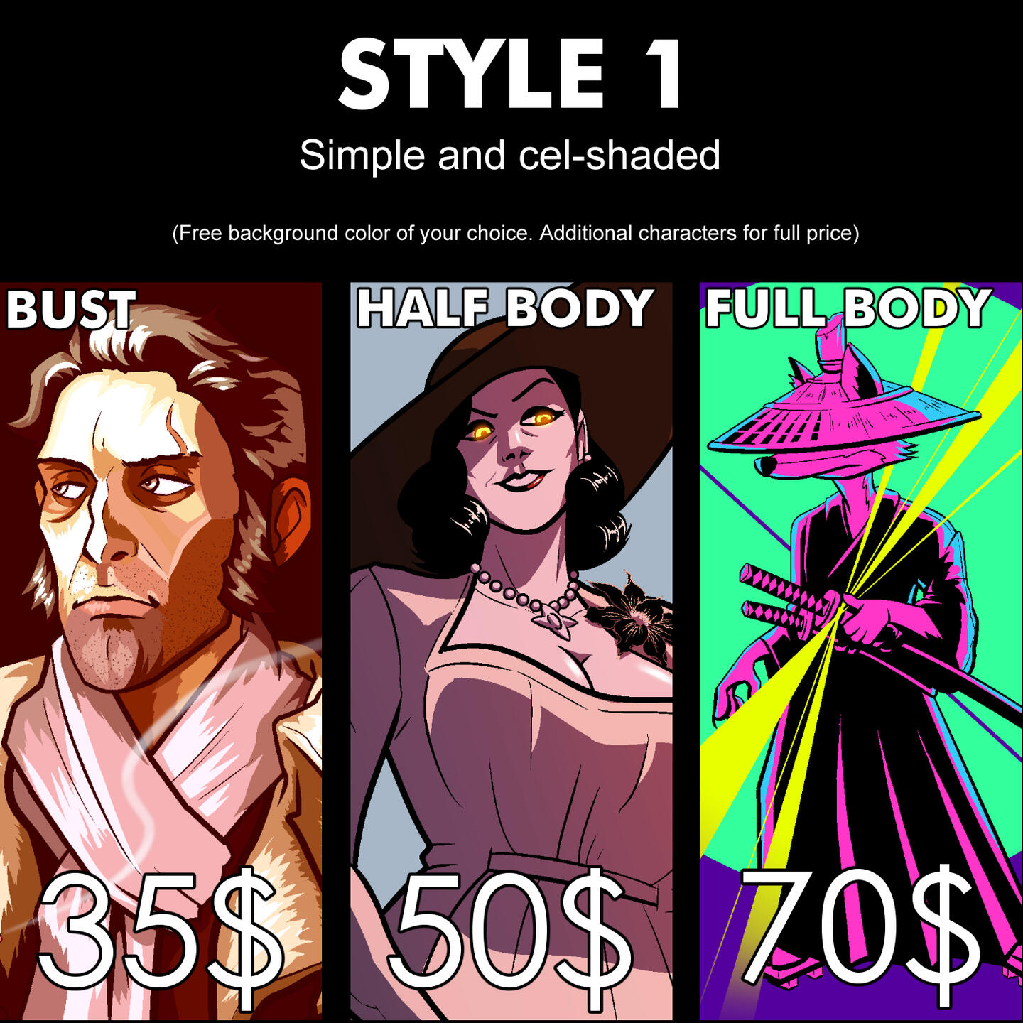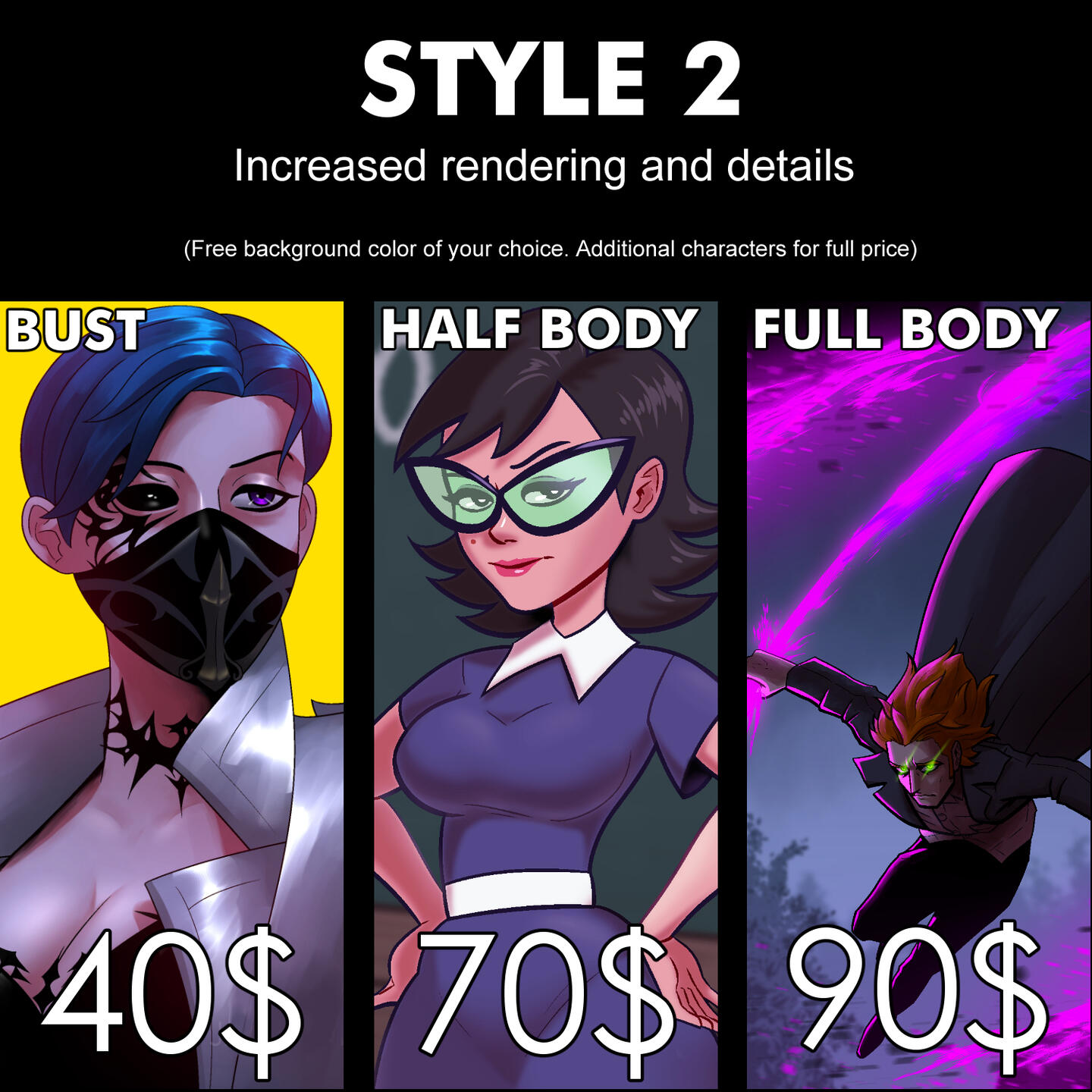• complex environments (subjective and open to discussion)Process:1. During conceptualization, I highly encourage you to be specific. References, color palettes, lighting, and other details not only help speed the process, but it also ensures that the final product will be as close to your vision as possible.2. After the service and price is agreed upon, I will begin working right away once full payment upfront is received.3. A rough sketch will be sent your way so we can discuss the overall composition of your choice. Adjustments such as pose changes, additional props, etc., are allowed at this step.4. Once a sketch is decided, I will now begin the linework. Major revisions will no longer be accepted at this part of the process. I will also let you know how soon you can expect to receive the finished product.5. That's it! Expect regular updates until the commission is completed.
